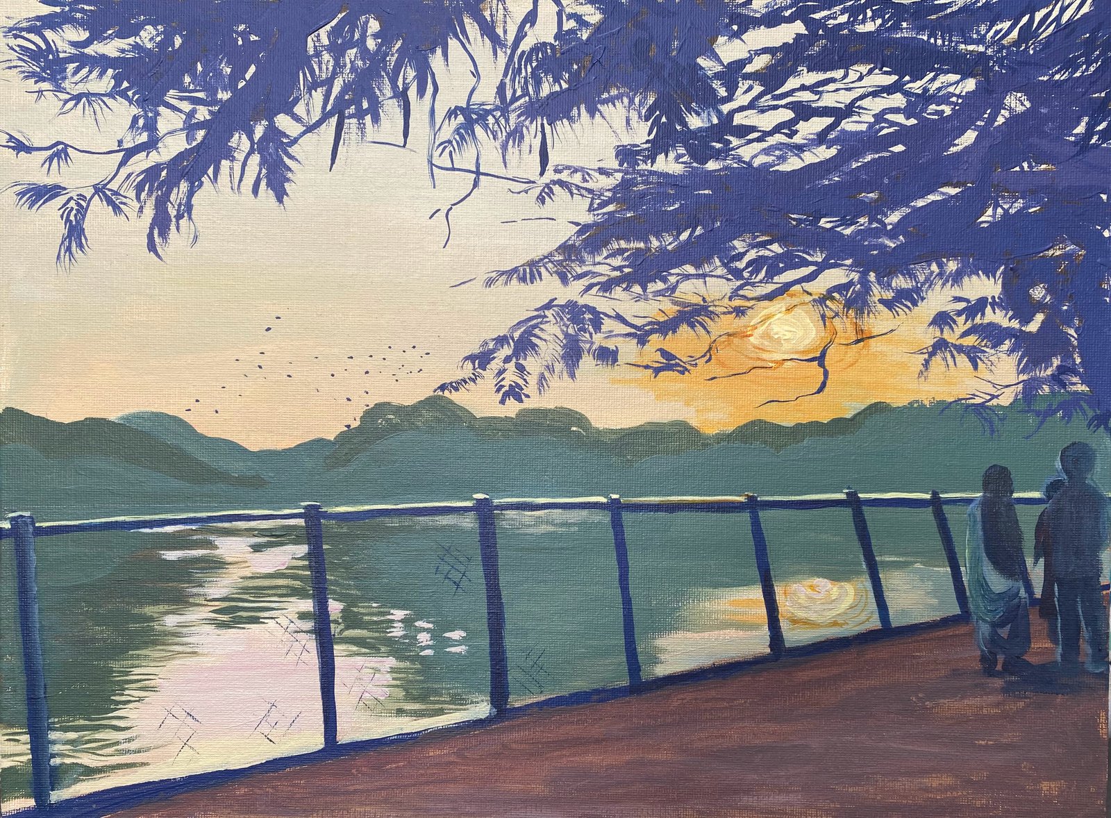 Lalbagh Lake at sunset - Bangalore, 2024, 30x40 cm, acrylic on board